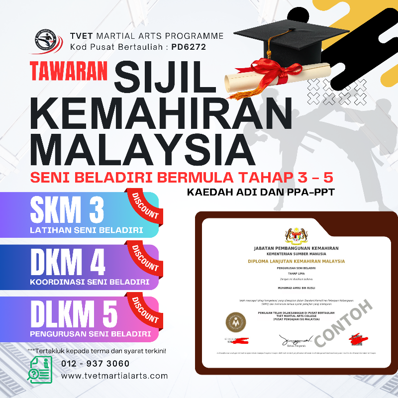 | SIJIL KEMAHIRAN MALAYSIA (SKM) TAHAP 3 | RM2999.00 | Harga asal RM5,000. Kini College TVET Martial Arts (ISG Malaysia) menawarkan RM2,999.00 sahaja untuk batch pertama di Pusat Bertauliah. Nikmati bimbingan lebih efisien, sistematik dan peluang pengiktirafan rasmi SKM dalam bidang seni beladiri. |